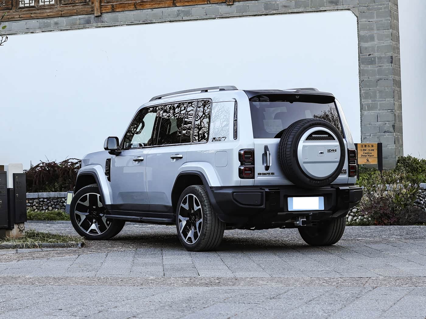 再来看车身侧面部分,iCAR V27延续了笔直硬朗的线条,一条腰线贯穿车门,搭配外扩的轮拱和大尺寸黑色轮毂,力量感十足,仿佛随时准备奔赴远方。5055/1976/1894mm的车身尺寸和2910mm的轴距,赋予了它中大型SUV的魁梧身姿,而近1:1的宽高比和直立A柱设计,不仅营造出了硬朗的视觉风格,更带来了通透的驾驶视野。短前悬和短后悬的设计,将四个车轮布置在车身四角,这种布局不仅提升了车辆的通过性,还为车内空间拓展创造了条件。侧裙配备的轻量化铝合金分段式侧踏,既方便了老人和孩子上下车,又进一步强化了硬派属性。