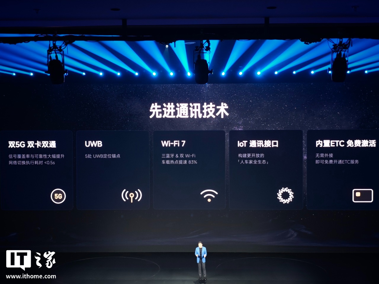 据介绍,新一代SU7还带来了更先进的通讯技术,包括双5G双卡双通、UWB近场控车、Wi-Fi7上车、IoT通讯接口、内置ETC(免费激活)等。