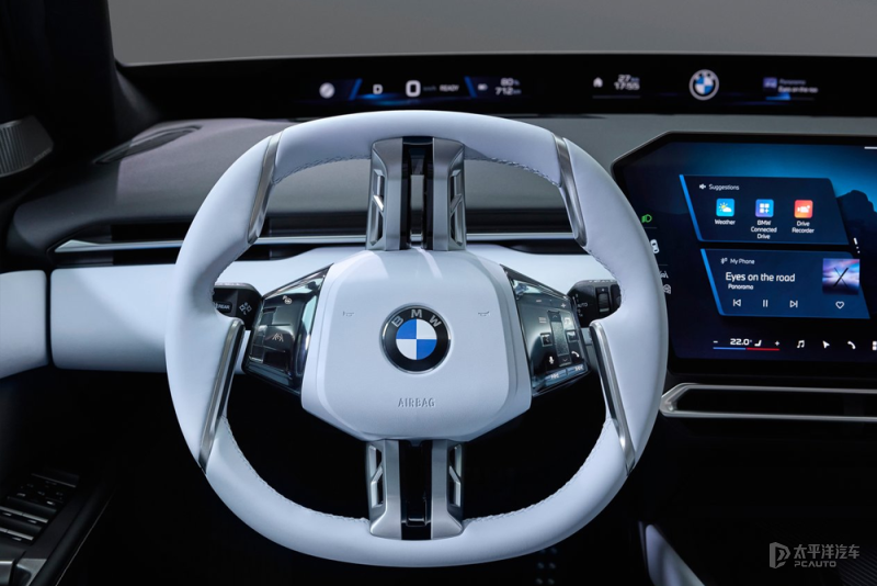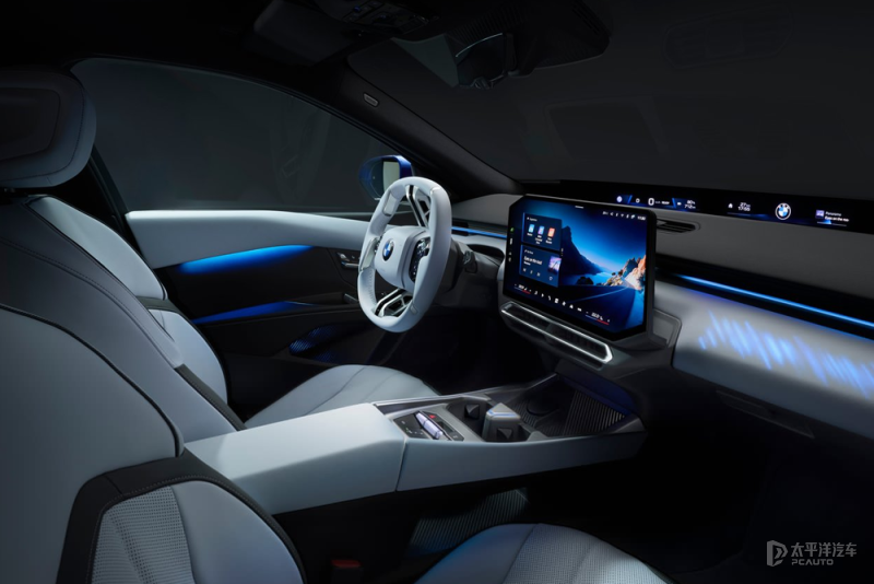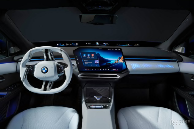 内饰使用白+灰配色搭配,搭载全景iDrive+智能座舱,中控配备17.9英寸无边框中控屏,提供视平线全景显示系统、3D抬头显示系统以及专属多功能方向盘等。其中全景iDrive视平线全景显示投影,采用超近距投影技术,在挡风玻璃上形成近40英寸、4K分辨率的投影画面,对比度达100000:1;配合纳米涂层挡风玻璃,其P光反射率为行业2倍,即便佩戴偏光墨镜也能清晰显示导航、车辆状态等信息,成像距离4至9米。