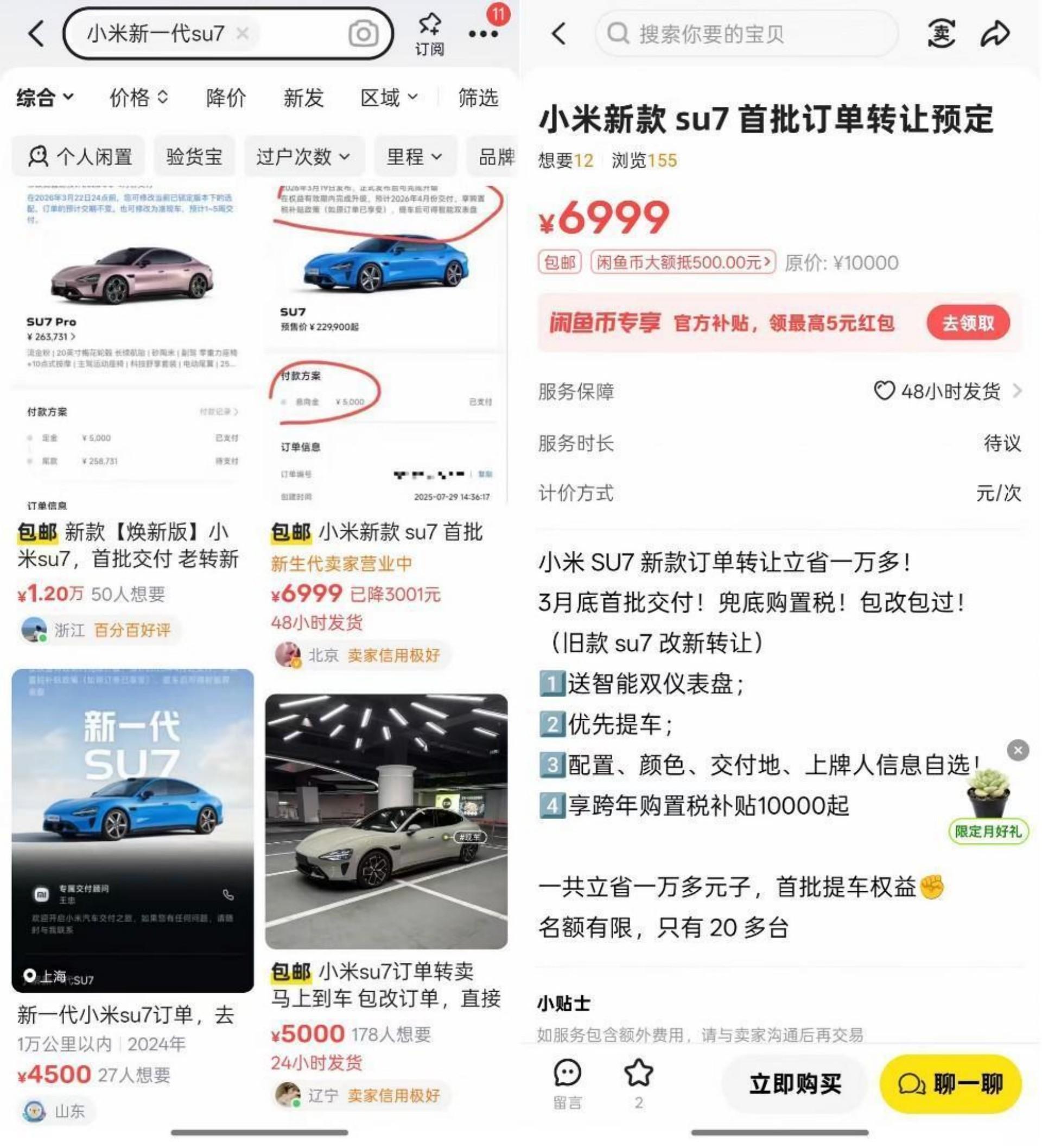 《汽车商业评论》同时注意到,新一代SU7发布当晚,闲鱼上迅速涌现出大批订单转让帖。