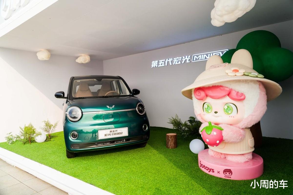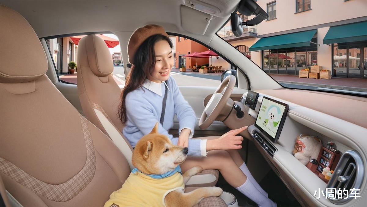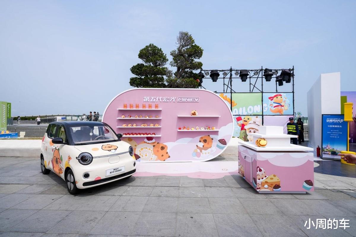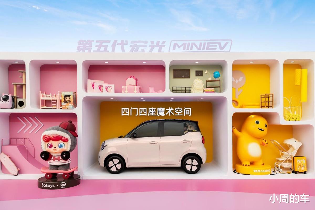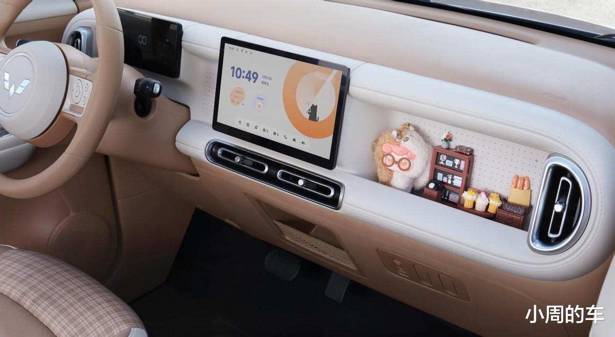 再来看内饰部分,“焦糖奶油”撞色配色,搭配环抱式座舱,营造出了时尚温馨的驾乘氛围,完全没有廉价感。在此基础上,第五代宏光MINIEV还给副驾设计了可以随便放置潮玩摆件的专属“百变造景空间”,妥妥的移动潮玩座舱。