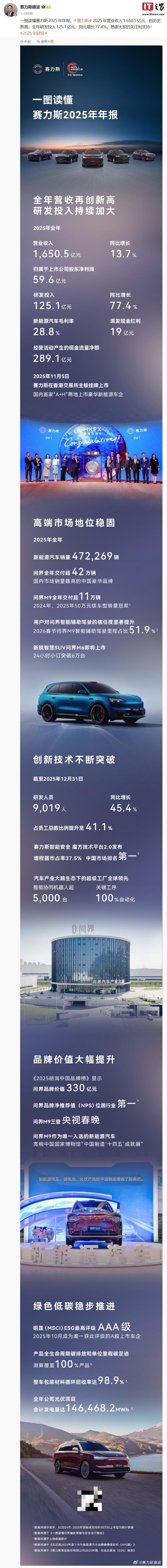 IT之家注意到,赛力斯集团副总裁康波发布了赛力斯2025年年报一图知,直观展示了公司营收数据、主营品牌销量情况等。