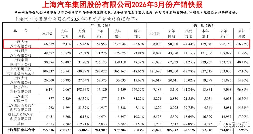 作为上汽集团的销量功臣之一,由奥迪、大众品牌、斯柯达组成的上汽大众,3月销量68000台,同比下滑24.44%,今年1-3月累计销量189940台,同比下滑16.75%。说实话,这已经是上汽大众连续多个月出现单月销量同比下滑了。