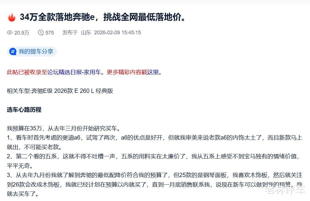 前不久我看了一个帖子,一位山东车主34万全款落地提了奔驰E级,并且要挑战全网最低落地价。当然,它提的并非奔驰E 300L,而是低功率的奔驰E 260L,所谓经典版,就是最低配(标配)车型。该车售价37.88万元,搭载了2.0T+9AT的动力总成,最大功率204马力,峰值扭矩320牛·米,7.7秒就能完成零百加速,虽然是低功率车型,但是动力输出完全够用。