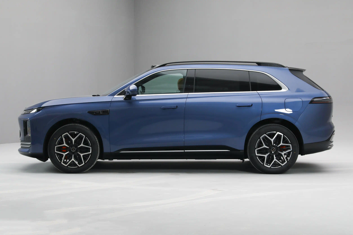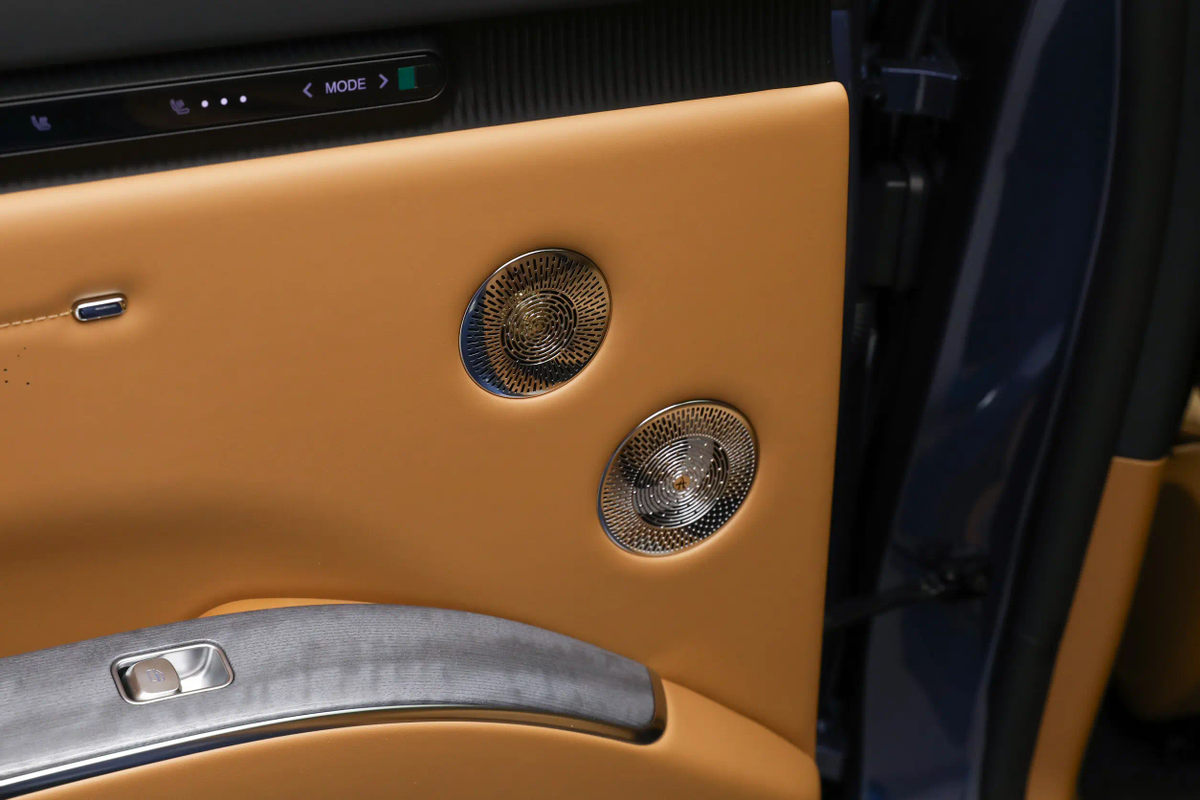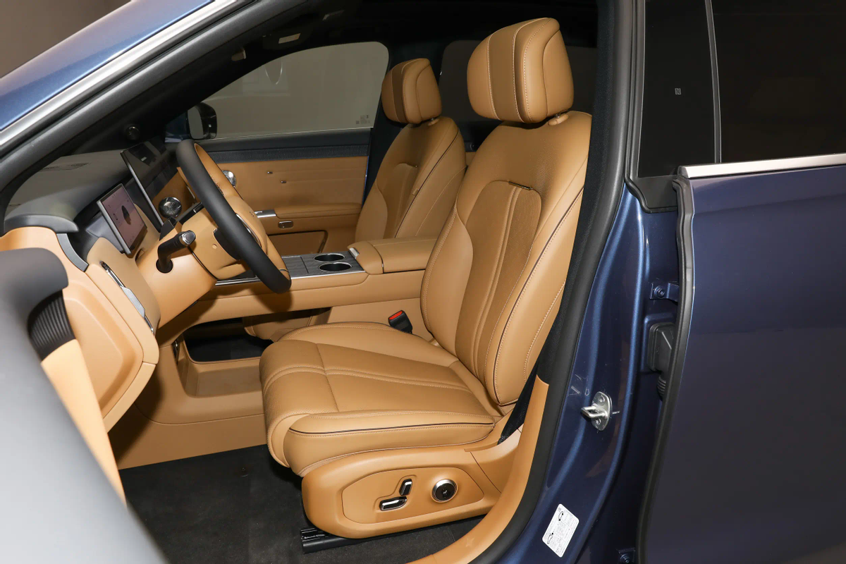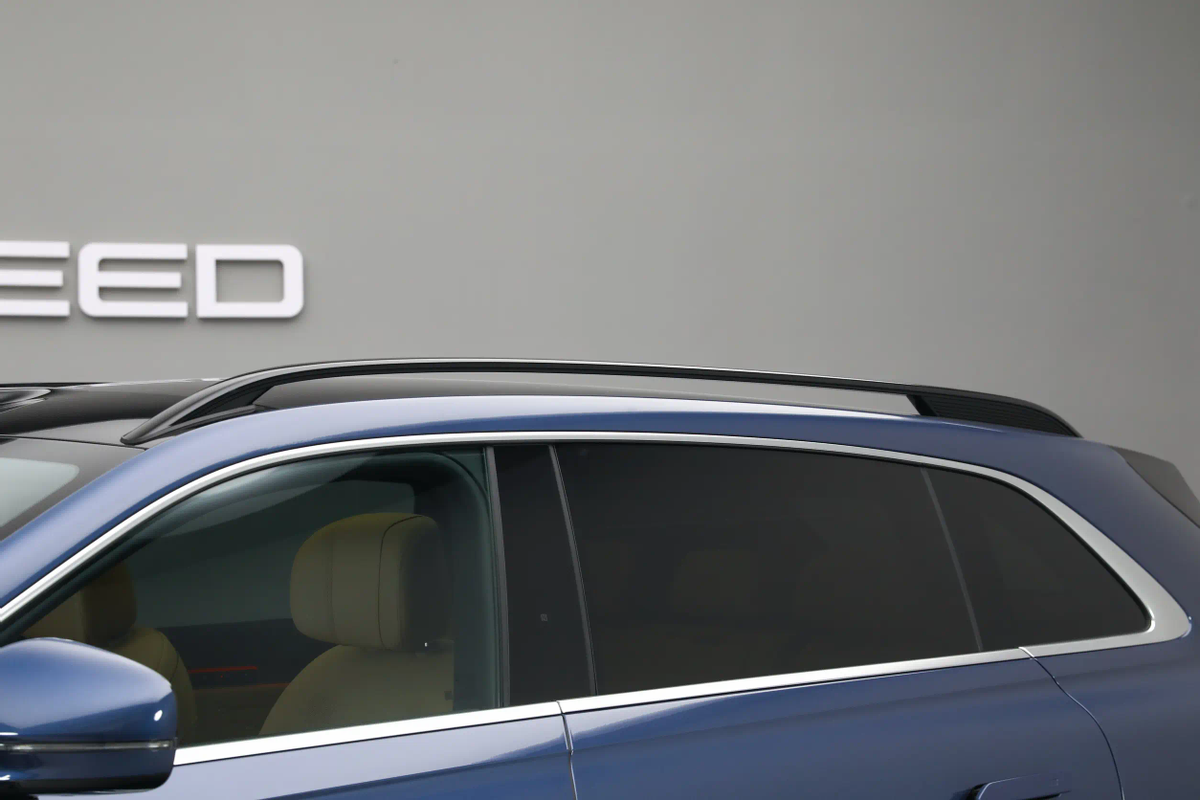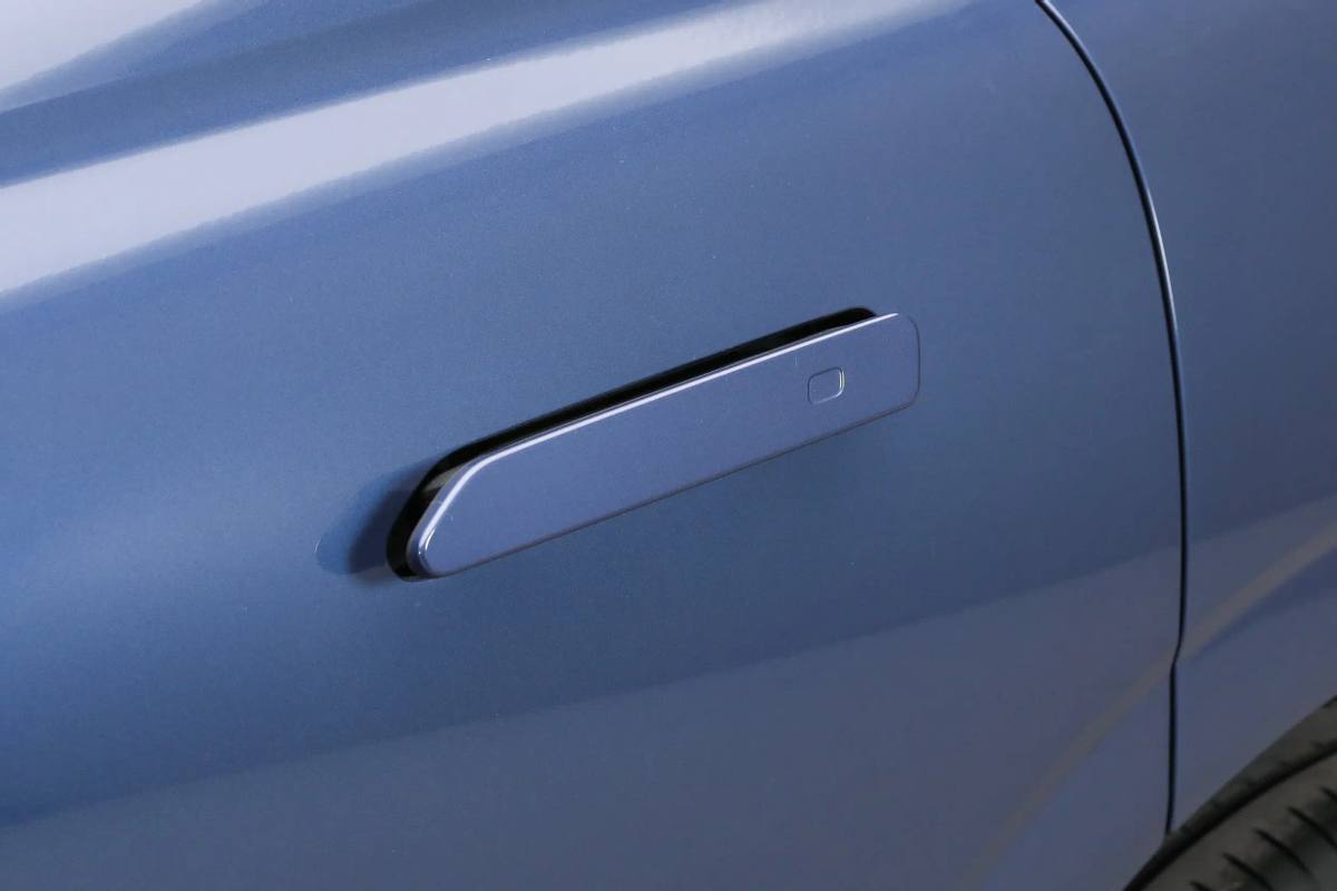 同时,车辆在车身侧面也有比较干练的线条构造。高腰线实际分为了前后两段,它们都诞生于各自临近的灯组边角之中,并配合车门底部所带有的立体弧形与防擦条,形成了更多光影变化。不过,车辆目前依旧在使用隐藏车门把手,不知道未来是否会有所变化。另外我也注意到,车辆包括后视镜支柱、车顶行李架,以及后风挡扰流板在内的配件,都采用了高亮黑色烤漆工艺,这倒是能让车辆看上去更显年轻态一些。