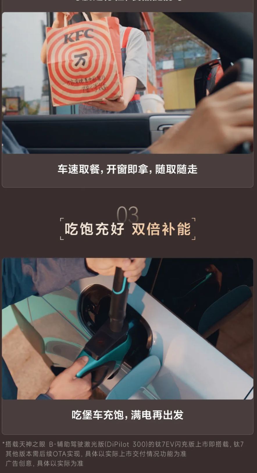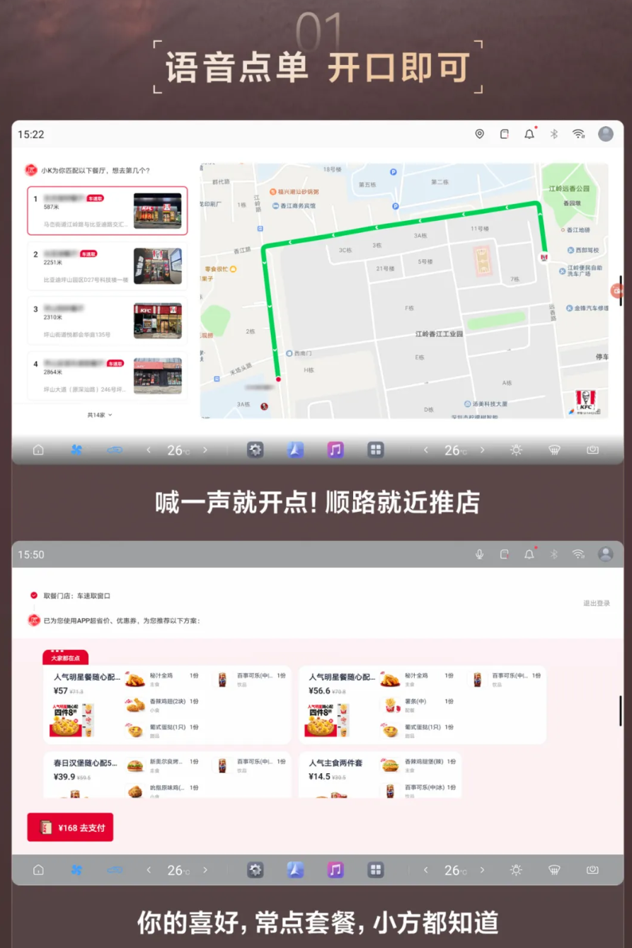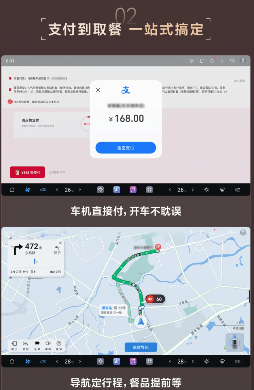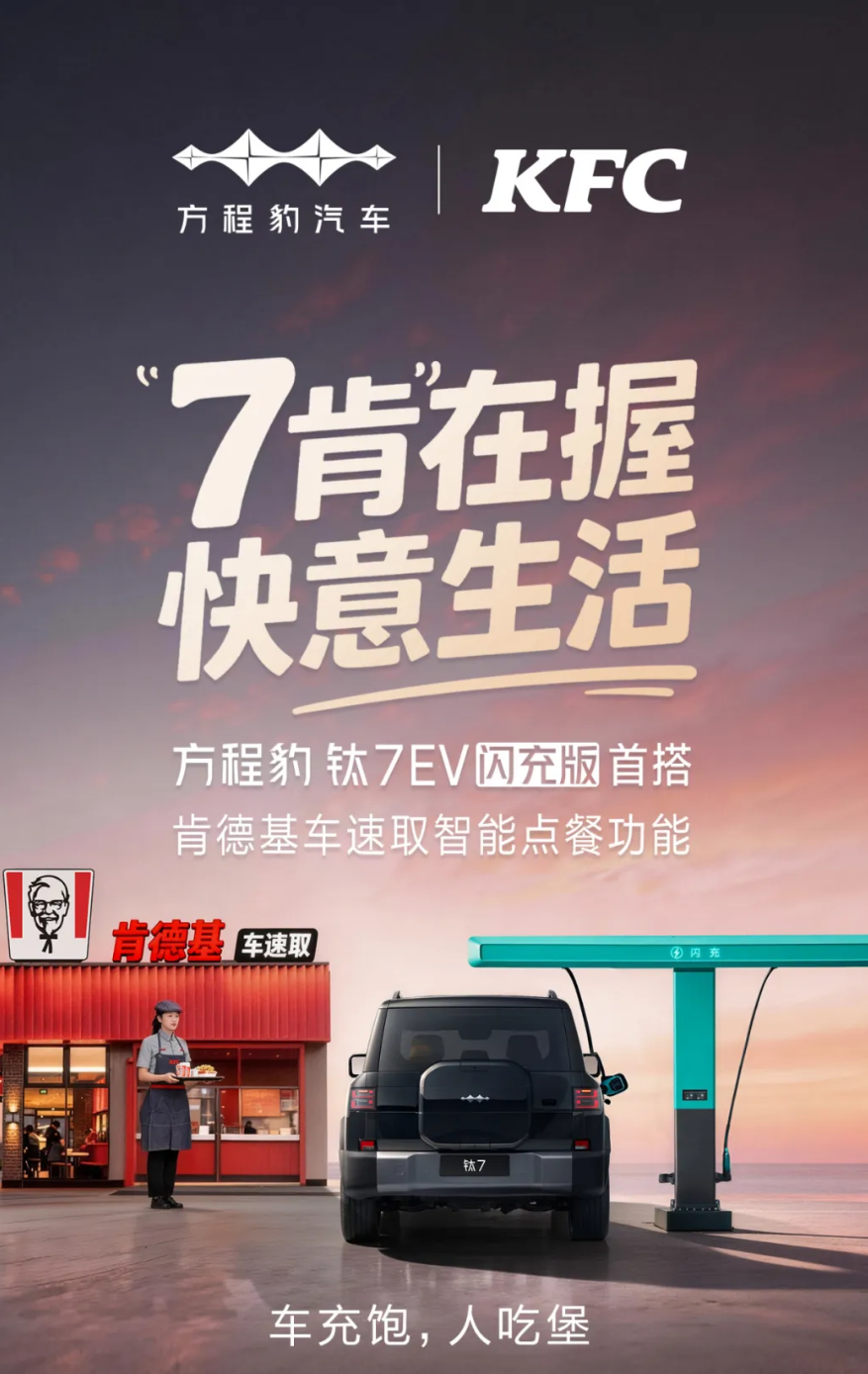 IT之家从官方公众号了解到,方程豹钛7EV闪充版能够在点餐前自动匹配最近肯德基,并且能够在车机上完成点餐、支付等流程,全程不需要借助手机。同时用户可以将车开到“车速取”取餐窗口,无需下车即可拿餐。
