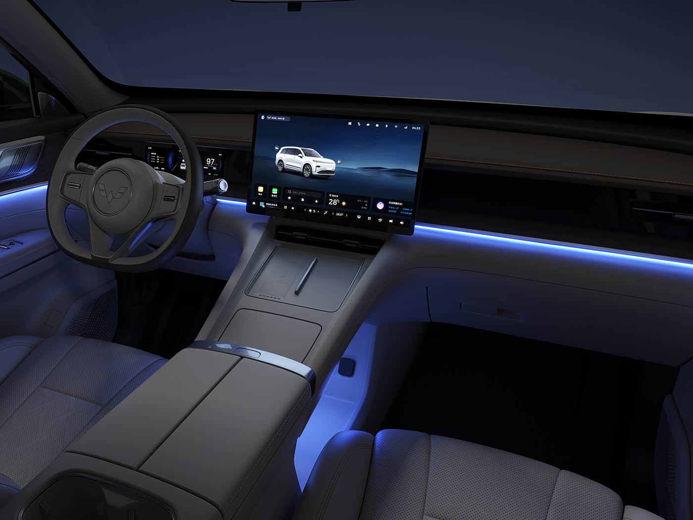 进入车内,内饰主打环抱式中式舒享座舱,提供砂陶棕、云釉白双配色,中控台核心是8.8英寸全液晶仪表 + 15.6英寸悬浮中控大屏组合,搭载五菱灵犀智驾系统 + 高通8155芯片,支持AI语音、540° 全景影像(含透明底盘)、HiCar/CarPlay全互联,响应快、无卡顿,智能体验拉满。方向盘为 D 型多功能皮质,握感舒适;采用电子怀挡设计,彻底释放中控台空间,下方超大储物格 + 50W无线充电 + 双杯架,实用性拉满。空间是核心优势,2950mm轴距带来越级5/6座布局,六座 2+2+2 为核心版本,第二排双独立航空座椅,支持电动调节、通风 / 加热 / 按摩、电动腿托,中间过道 220mm,上下车便捷。