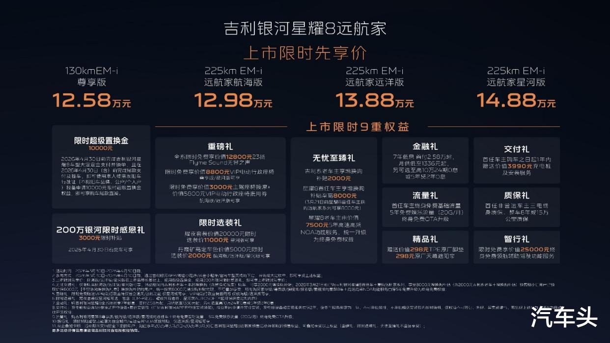 4月14日,2026款吉利银河星耀8远航家在广州正式完成区域上市。作为面向华南市场的重要产品节点,本次活动不仅发布了多款配置车型,同时还同步开放试驾及全场景泊车体验环节。新车上市限时先享价区间为12.58万至14.88万元,进一步丰富了吉利银河在中高级新能源轿车领域的产品布局。