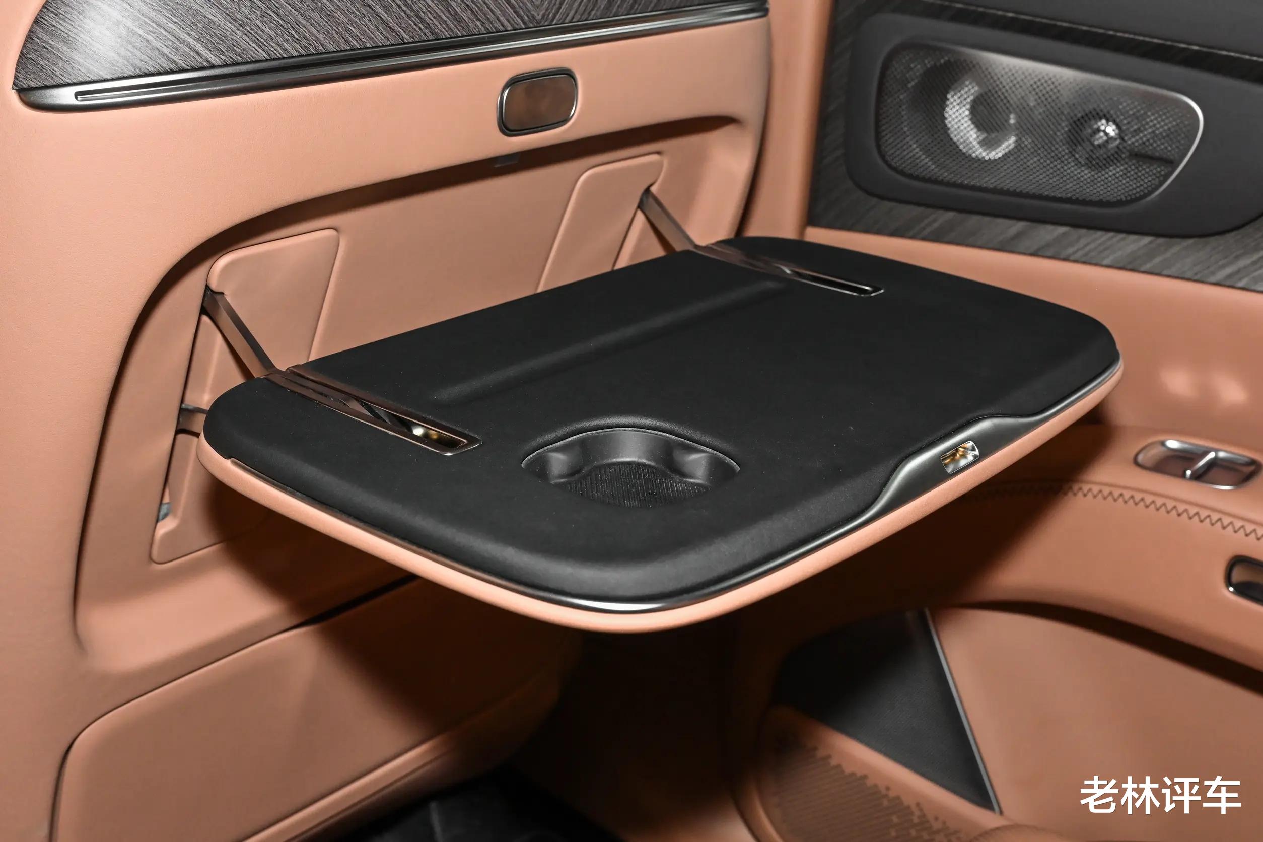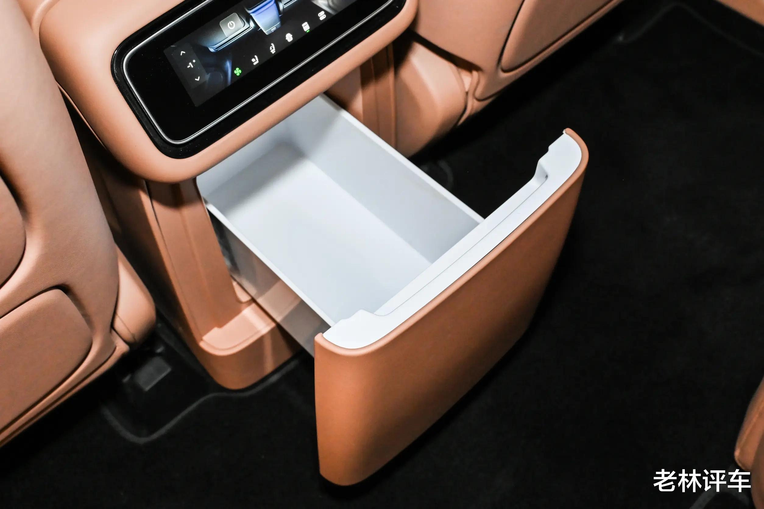 座椅方面,除了纯电车型提供一款7座车型外,其余车型都是2+2+2的6座布局,第二排右侧是零重力座椅,支持一键零重力模式,想要座椅加热/通风/按摩都可以,还带有腿托调节,乘坐体验十分舒适。还能看到,该车提供车载冰箱、后排小桌板和后排吸顶娱乐屏幕等。