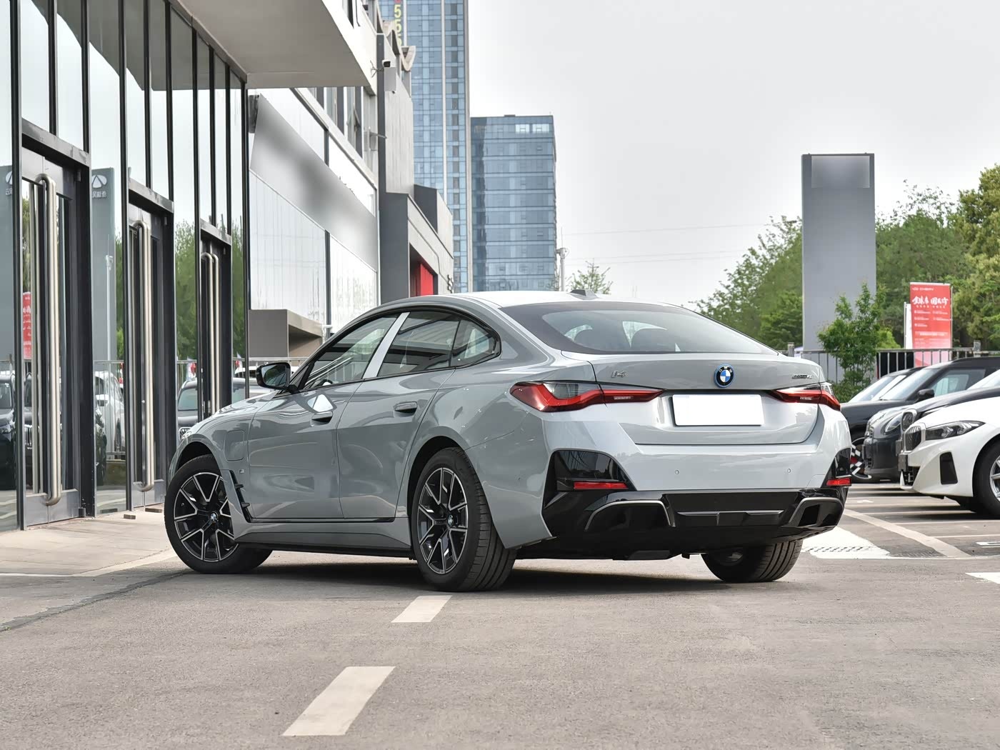 再来看车身侧面部分,2026款宝马i4呈现出典型的轿跑车姿态。短前悬、长后悬的设计,搭配大溜背式的车顶线条,营造出优雅而动感的视觉效果。车身线条简洁流畅,从前翼子板延伸至车尾的腰线,勾勒出车身的肌肉感。银色的窗线饰条,为侧面增添了一丝精致感,多辐式轮毂配合低趴的车身姿态,进一步强化了运动属性。车身尺寸方面,2026款宝马i4的长宽高分别为4785mm×1852mm×1455mm,轴距达到2856mm。在同级车型中,这样的尺寸表现中规中矩,但得益于轿跑车的造型设计,视觉上显得更加修长。