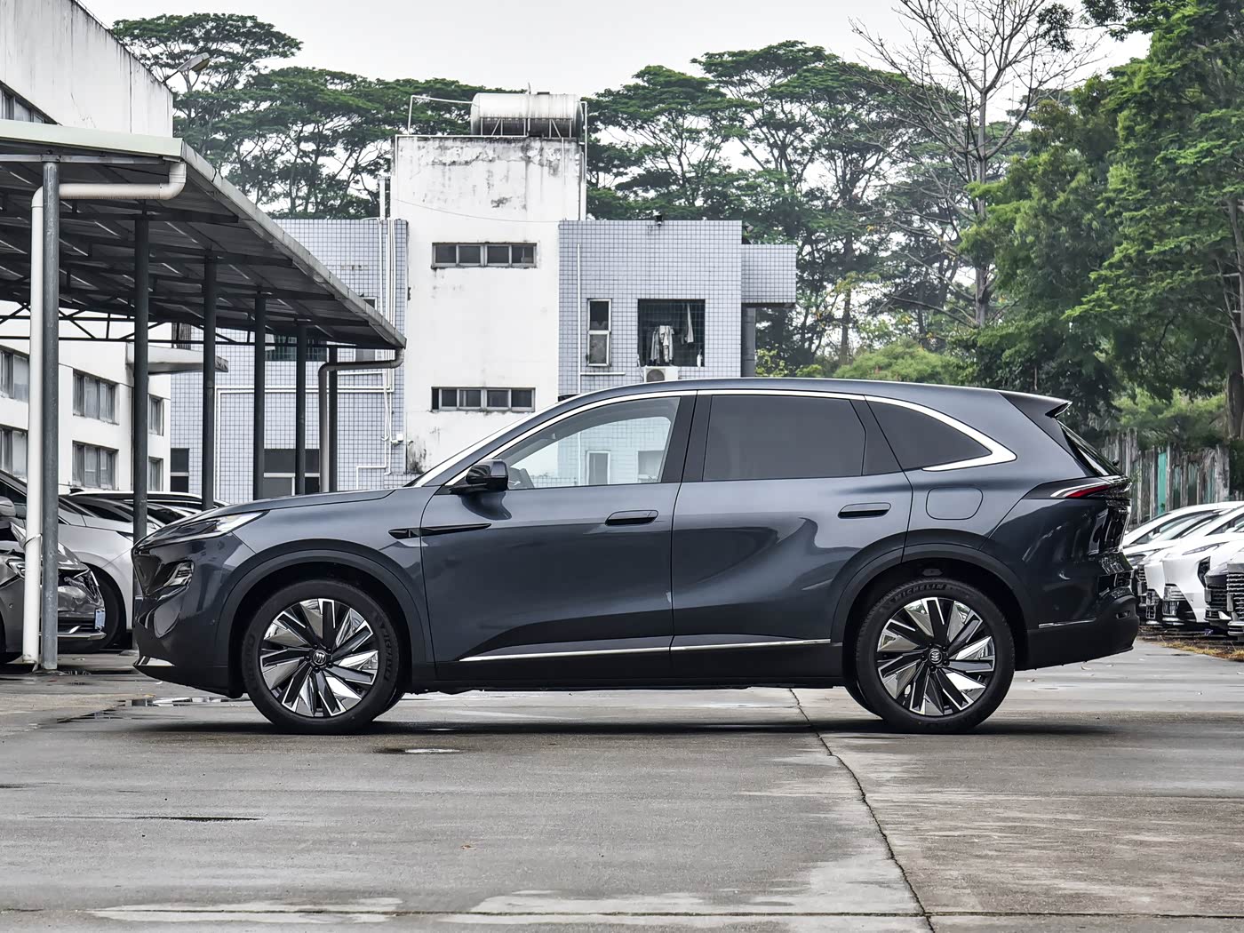 再来看车身侧面部分,车身尺寸方面,别克至境E7的长宽高分别为4850/1910/1676mm,轴距达2850mm,比昂科威Plus还要大,在同级车型中优势明显。侧面线条流畅饱满,俯冲式的车身姿态搭配20英寸多幅式亮面轮毂,既显大气又不失动感。细节之处,车窗上沿与侧裙的镀铬饰条点缀恰到好处,提升了整车的精致感;隐藏式门把手不仅降低了风阻,更增添了科技氛围。