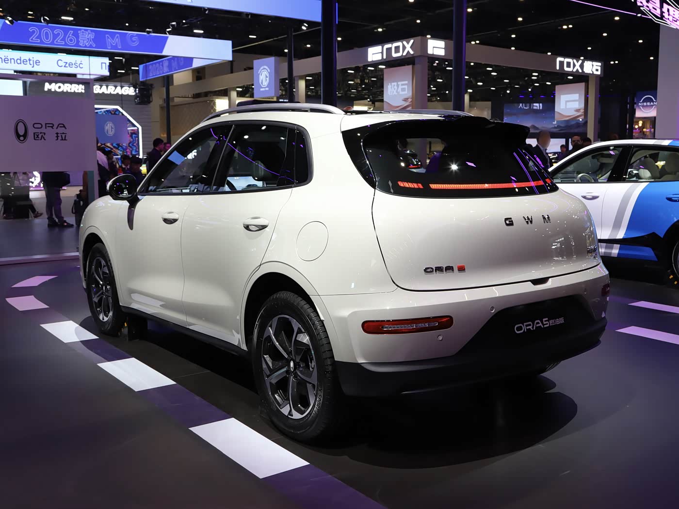 再来看车尾部分,车尾设计简约饱满、层次丰富,与前脸圆润风格完美呼应。顶部大尺寸扰流板优化风阻,高位刹车灯嵌入其中,提升行车安全。地平线贯穿式 LED 尾灯纤细立体,内部灯珠排列均匀,点亮后形成连贯光幕,中央欧拉标识可发光,夜间辨识度拉满。车尾中央内凹式设计增强立体感,牌照框区域精致内敛。下包围黑色护板搭配银色饰条,与前脸、侧面设计统一,隐藏式排气布局让尾部干净利落。“ORA 5” 字母标识醒目大气,专属运动款新增红色饰条与扩散器造型,强化运动属性。