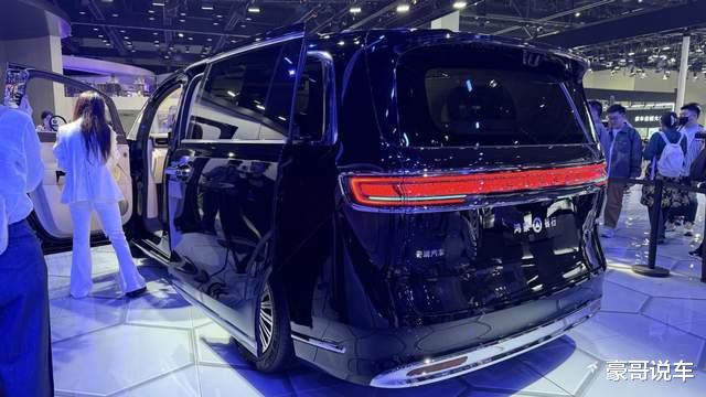 侧面,平直的车身线条即是对车内空间的保证,也进一步增加了整车的“大”。配合隐藏式门把手和带交互式光毯的电动侧滑门,仪式感拉满。车尾的贯穿式晶钻尾灯与前脸呼应,点亮后辨识度极高。