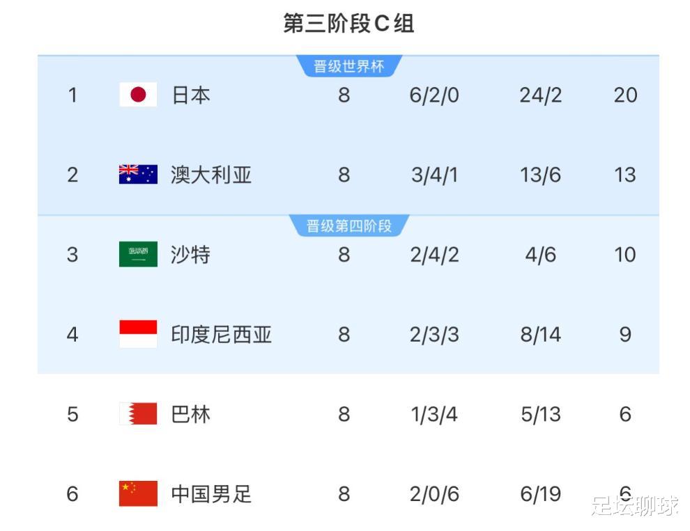日本积20分,提前两轮锁定第一;澳大利亚积13分,坐稳第二;沙特积10分,排名第三;印尼积9分,占据争四主动权;巴林跟国足同积6分,因净胜球不同,分列第五、第六,争四形势不容乐观。