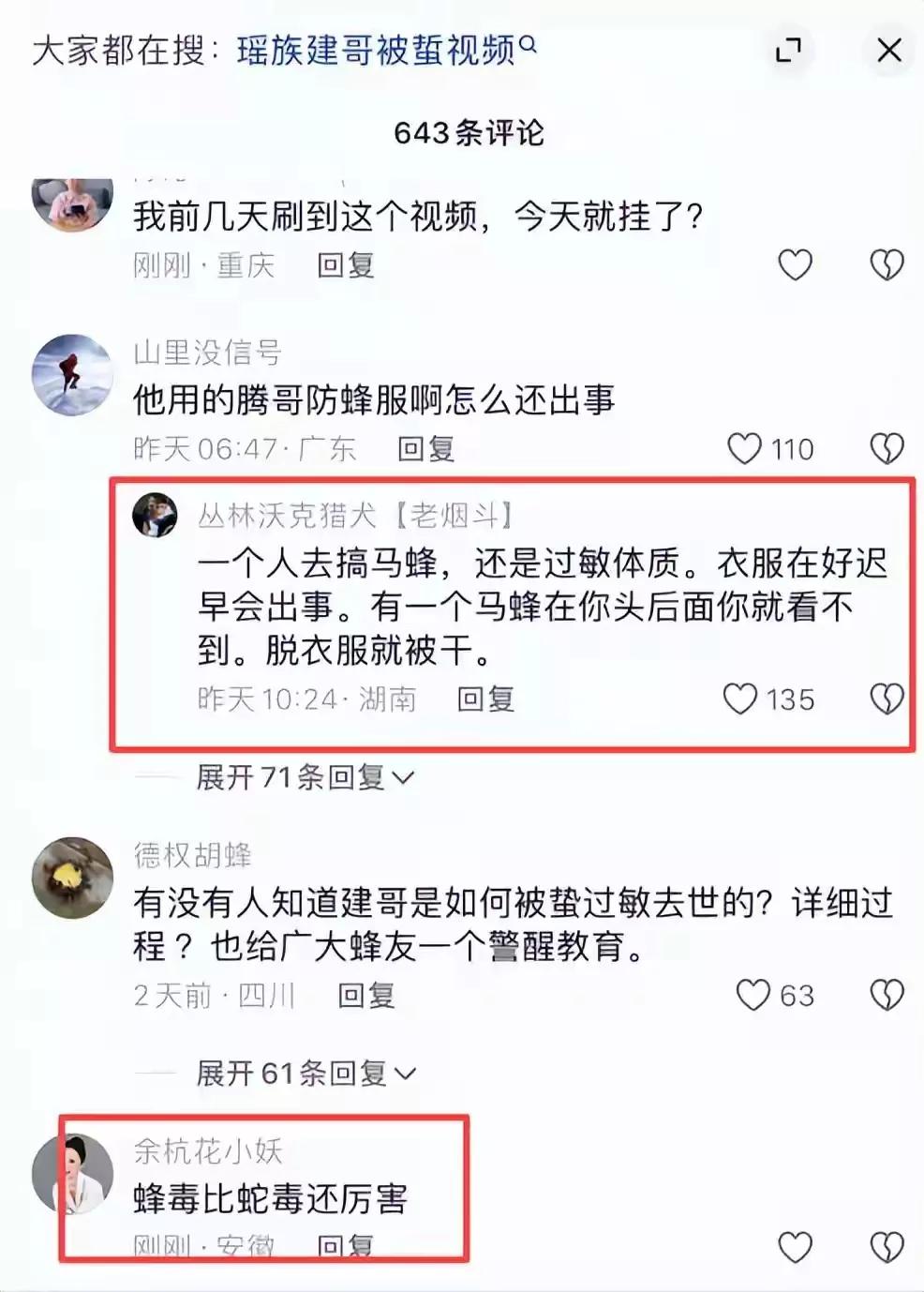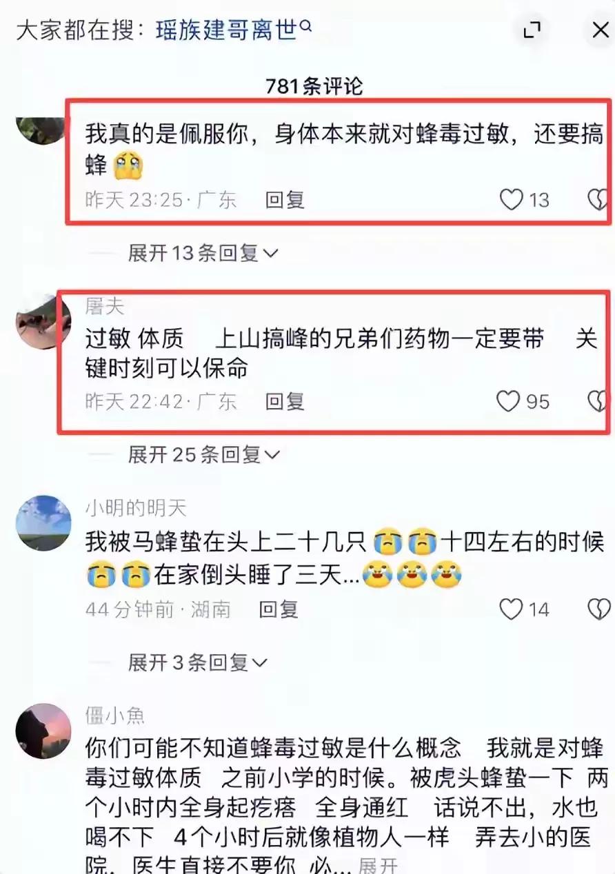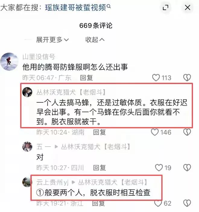 还有人早就提醒过他,捅马蜂窝不能一个人去。行里的人都说,最少得两个人,干完活互相看看身上有没有马蜂,再脱衣服。可建哥没听进去。他还在评论区跟粉丝开过玩笑,说要是哪天我不更新视频了,那就是哇塞了(方言里差不多是‘没了’的意思)。结果两年前说的话,真就应验了,想想都让人心里发紧。