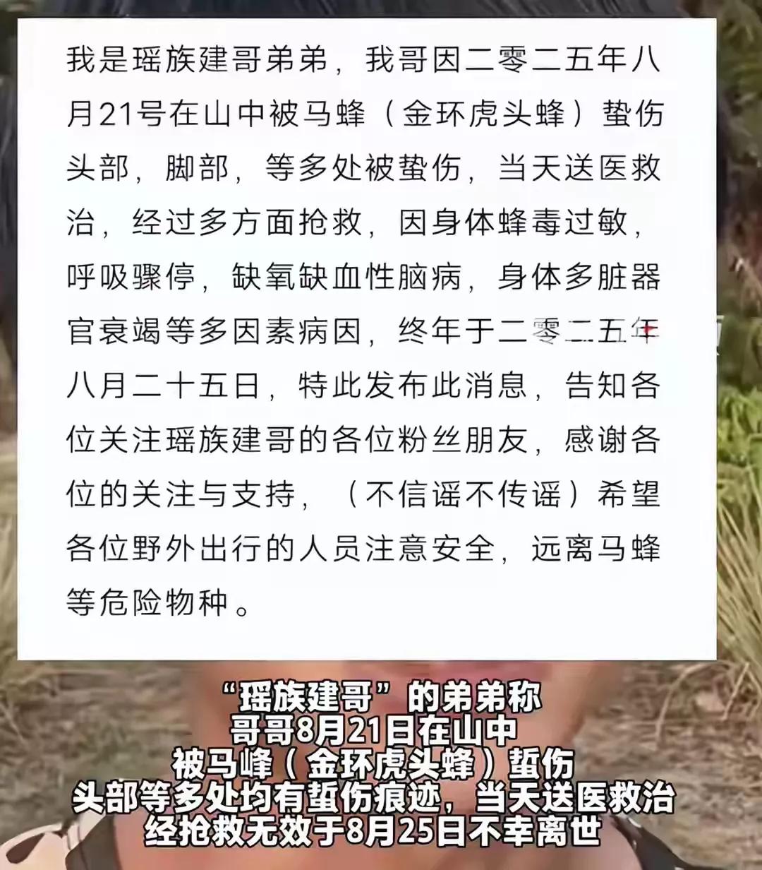 九月初,网红圈传来一个让人心里发闷的消息,户外博主“瑶族建哥”没了,才20岁左右,被山里最毒的金环虎头蜂蜇死了。