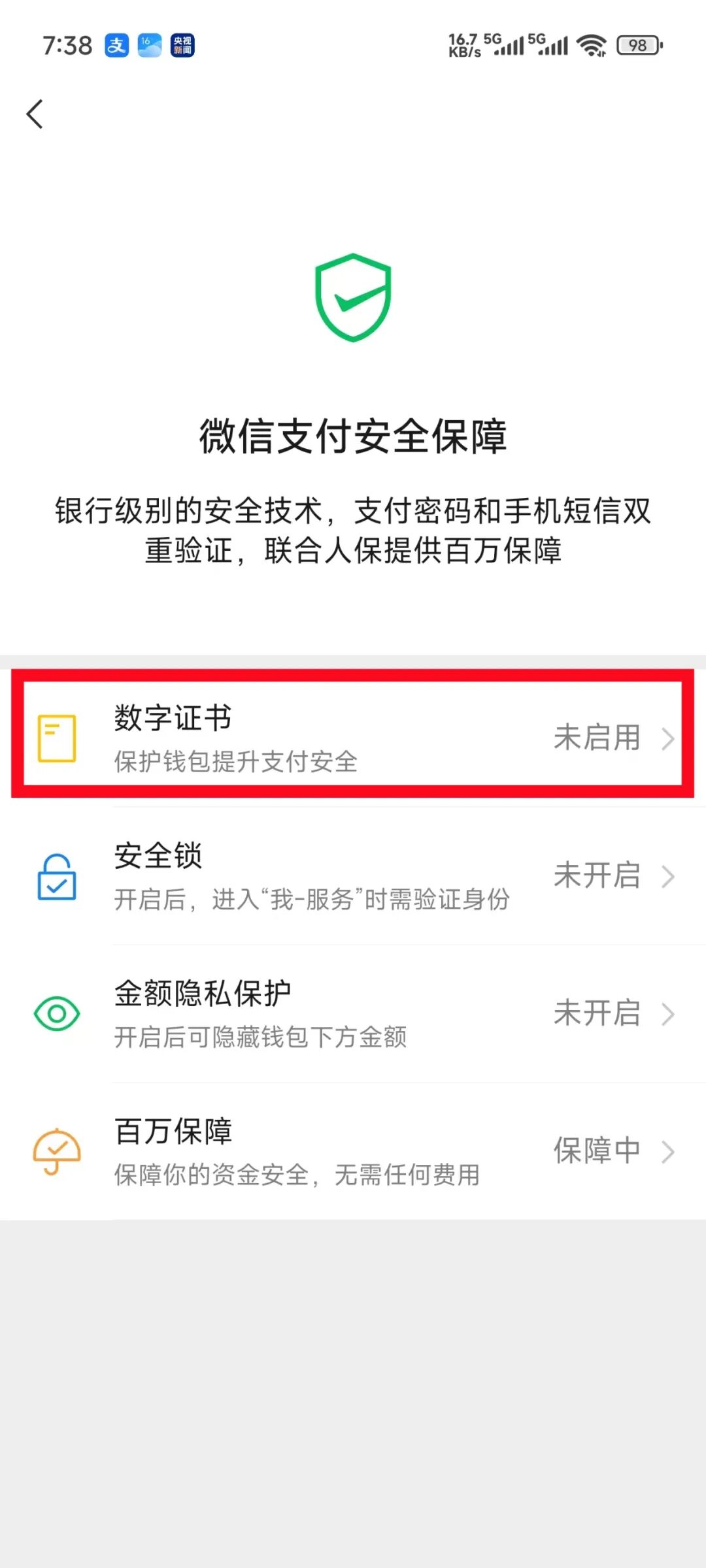 第四步:选择“数字证书”,选择“直接启用”,按提示输入身份证号码完成验证即可启用。这个证书相当于你微信支付的身份证,只有你的微信账号才能使用,可以有效防止微信支付被盗刷。