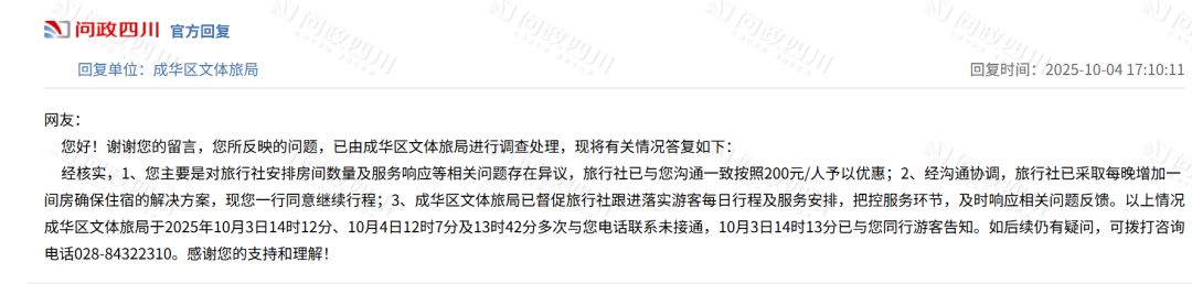 对此,10月4日,成都市成华区文体旅局在“问政四川”平台回复该投诉称,经核实,游客主要对旅行社安排房间数量及服务响应等相关问题存在异议,旅行社已与投诉游客沟通一致,按照200元/人予以优惠;另经沟通协调,旅行社已采取每晚增加一间房确保住宿的解决方案,游客一行同意继续行程。
