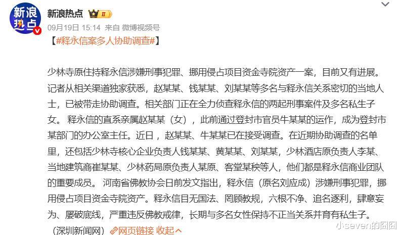 根据某个地方的新闻通报,关于释永信的调查有了新的进展,据悉这一次有多人协助调查,而在这些人当中更是有着疑似释永信的私生女被曝光。