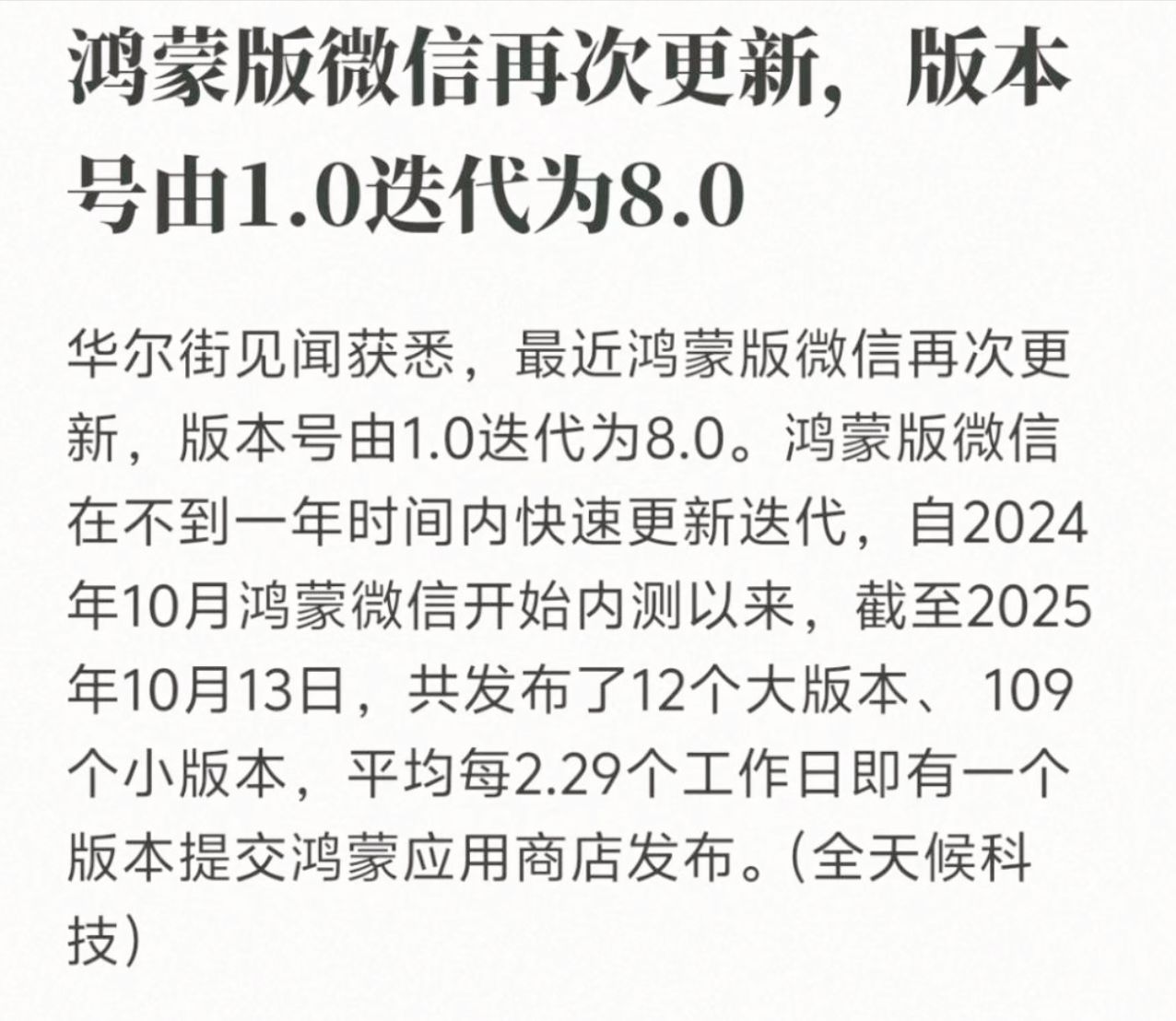 也就是说,从2024年10月鸿蒙微信正式上线到现在,它在一年时间里完成了12个大版本、109个小版本的演进,终于追平安卓和iOS。这对一个独立生态来说,是里程碑级的事件。