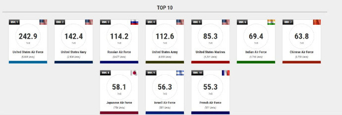 根据WDMMA的说法,该智库是使用所谓“TruVal评分”确定各国空军的整体能力,参考了与航空能力相关的各种因素,包括整体实力、现代化水平、后勤、攻击和防御能力等。“评估一个大国的空军实力不仅看其战机总量,还要评估其质量和航空能力,一些容易被忽视的能力可能获得更大的权重,包括特种任务飞机、专用轰炸机、教练机和空中指挥平台。此外,还要关注当地航空工业能力和部队经验等。”