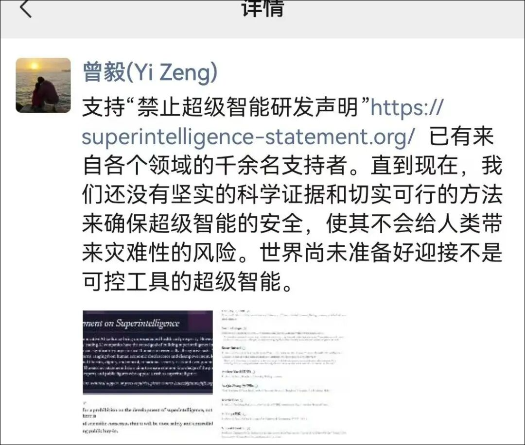 “世界尚未准备好迎接不是可控工具的超级智能。”参与本次联署的北京前瞻人工智能安全与治理研究院院长,中国科学院自动化研究所研究员曾毅在个人微信朋友圈直言:“目前我们还没有坚实的科学证据和切实可行的方法来确保超级智能的安全,使其不会给人类带来灾难性的风险。”