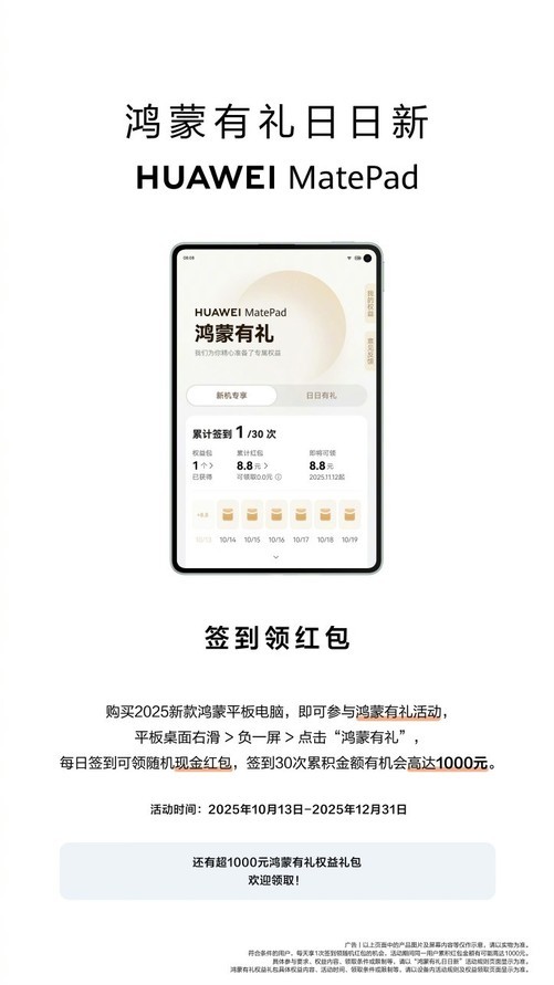 此外,华为MatePad系列鸿蒙有礼日日新签到领红包活动现已开启,购买华为MatePadMini可参与活动,每日签到领取随机红包,签到30次累积金额有机会高达1000元。