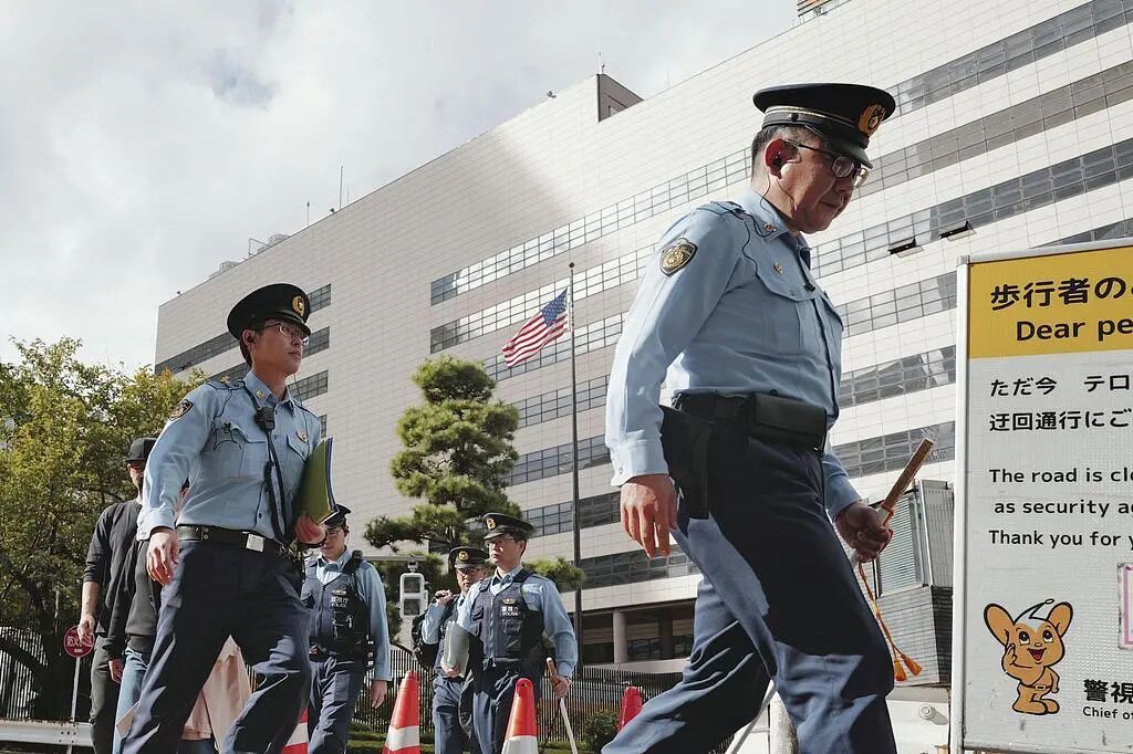 当地时间2025年10月27日,日本东京,在美国总统特朗普当天晚些时候访问日本前,警察在美国大使馆附近巡逻。