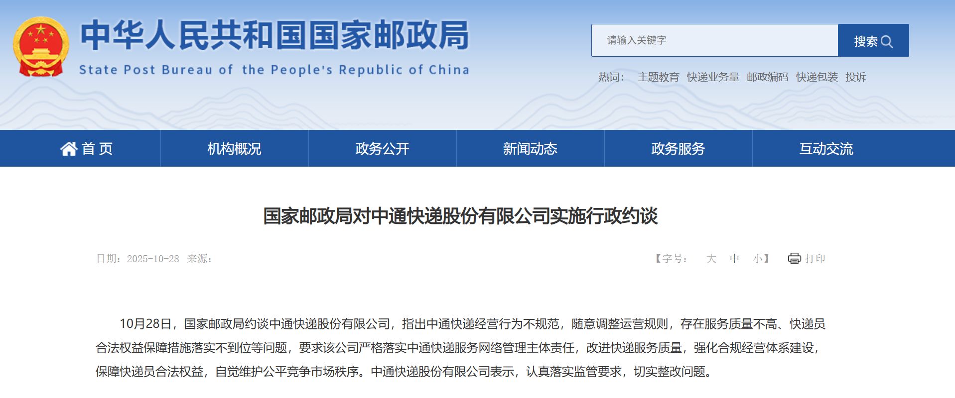 据国家邮政局官网,10月28日,国家邮政局约谈中通快递股份有限公司,指出中通快递经营行为不规范,随意调整运营规则,存在服务质量不高、快递员合法权益保障措施落实不到位等问题,要求该公司严格落实中通快递服务网络管理主体责任,改进快递服务质量,强化合规经营体系建设,保障快递员合法权益,自觉维护公平竞争市场秩序。中通快递股份有限公司表示,认真落实监管要求,切实整改问题。