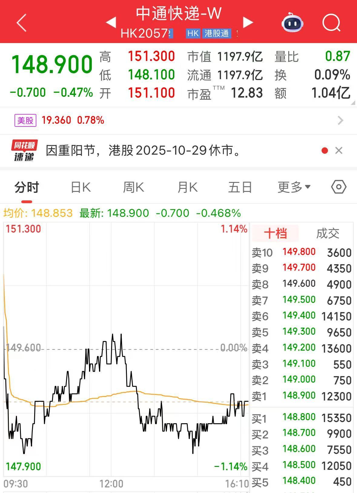 截至10月28日港股收盘,中通快递股价下跌0.47%,市值1197.9亿港元。
