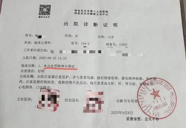 8月25日,王女士筹了2万元,带小郝前往呼伦贝尔某精神卫生医院看病,病历显示,小郝被诊断为未分化型精神分裂症。