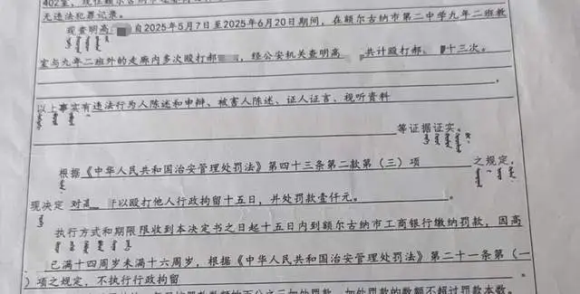 根据额尔古纳市公安局7月22日出具的《行政处罚决定书》显示,高某,女,15岁。2025年5月7日至6月20日期间,在额尔古纳市第二中学班级里与班级外的走廊内多次殴打小郝,经公安机关查明,高某共计殴打小郝13次。
