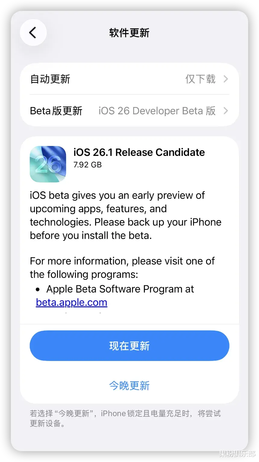 此前已更新 iOS 26 的用户,现在就可以去升级最新的 RC 版系统了。