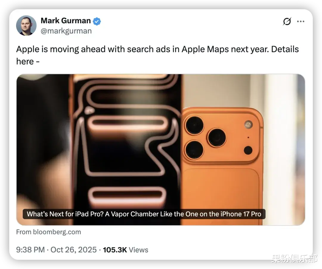 据 Mark Gurman 透露,苹果正致力于加大广告服务在自家原生应用的投入。
