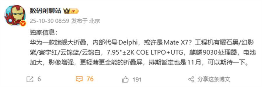 今日,数码博主“数码闲聊站”曝光华为全新旗舰大折叠屏新品,内部代号Delphi,确认将是华为MateX7系列,暂定11月正式亮相。作为华为折叠屏阵营的新一代旗舰,该机不仅首发全新处理器,还在配色、屏幕、影像等方面全面升级,堪称更轻薄、更全能的折叠屏新标杆。
