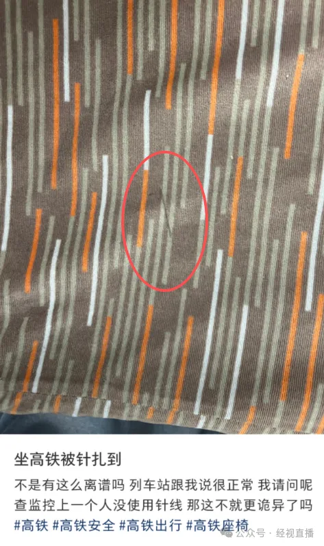 10月25日,有网友发帖称,乘坐高铁时被座椅上的绣花针扎到,且查询监控发现上一名乘客未使用针线。