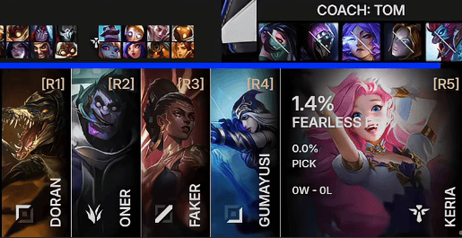 T1选用:Doran鳄鱼;Oner蒙多;Faker梅尔;Gumayusi艾希;Keria萨勒芬妮