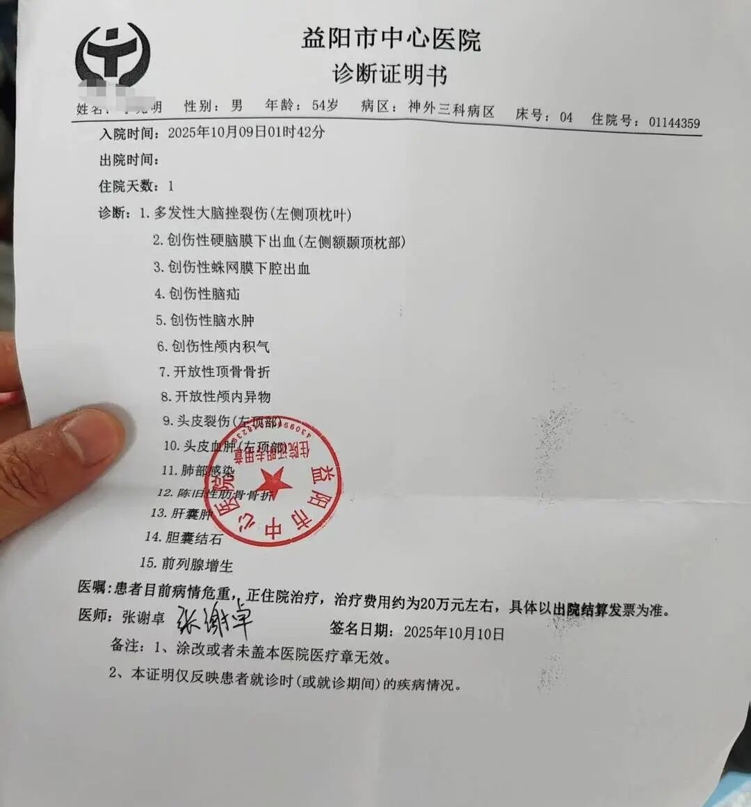 目前,李斌已住院治疗20多天,依旧处于昏迷状态。他的入院报告显示,他在10月9日1点49分被送往益阳市中心医院,被诊断为多发性大脑挫裂伤(左侧顶枕叶)、创伤性硬脑膜下出血、创伤性脑水肿、开放性顶骨骨折、开放性颅内异物;患者病情危重,治疗费用约20万元左右,具体以出院结算发票为准。
