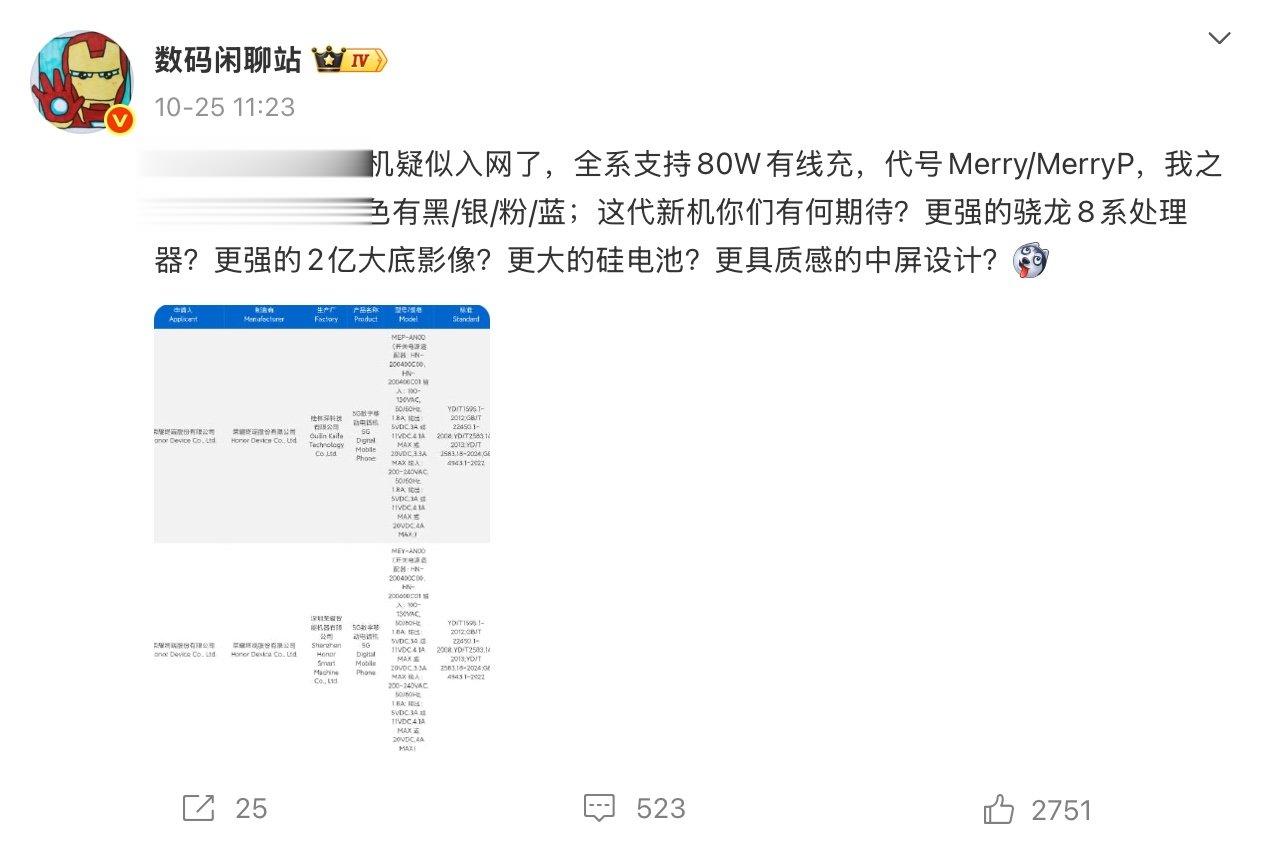 不仅如此,该博主还表示,荣耀500系列在影像、性能、电池、外围等都有不小的提升,是同档位TOP级的用料,价格或许会有上涨。而根据此前的曝光信息,荣耀500全系支持80W有线充,样机有蓝色、银色、粉色和蓝色四款配色可选。