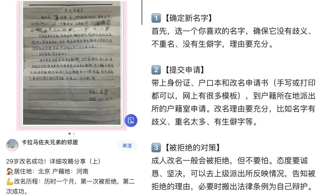 中青报·中青网记者注意到,许多有改名需求的网友倾向于先在社交平台寻求经验。有不少网友分享“改名成功”的经验帖。
