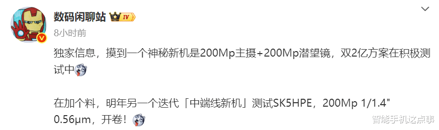 博主爆料其搭载代号为SK5HPE的传感器,据传是三星HP9的升级版。它的关键参数是:2亿像素、1/1.4英寸大底、0.56微米像素尺寸。