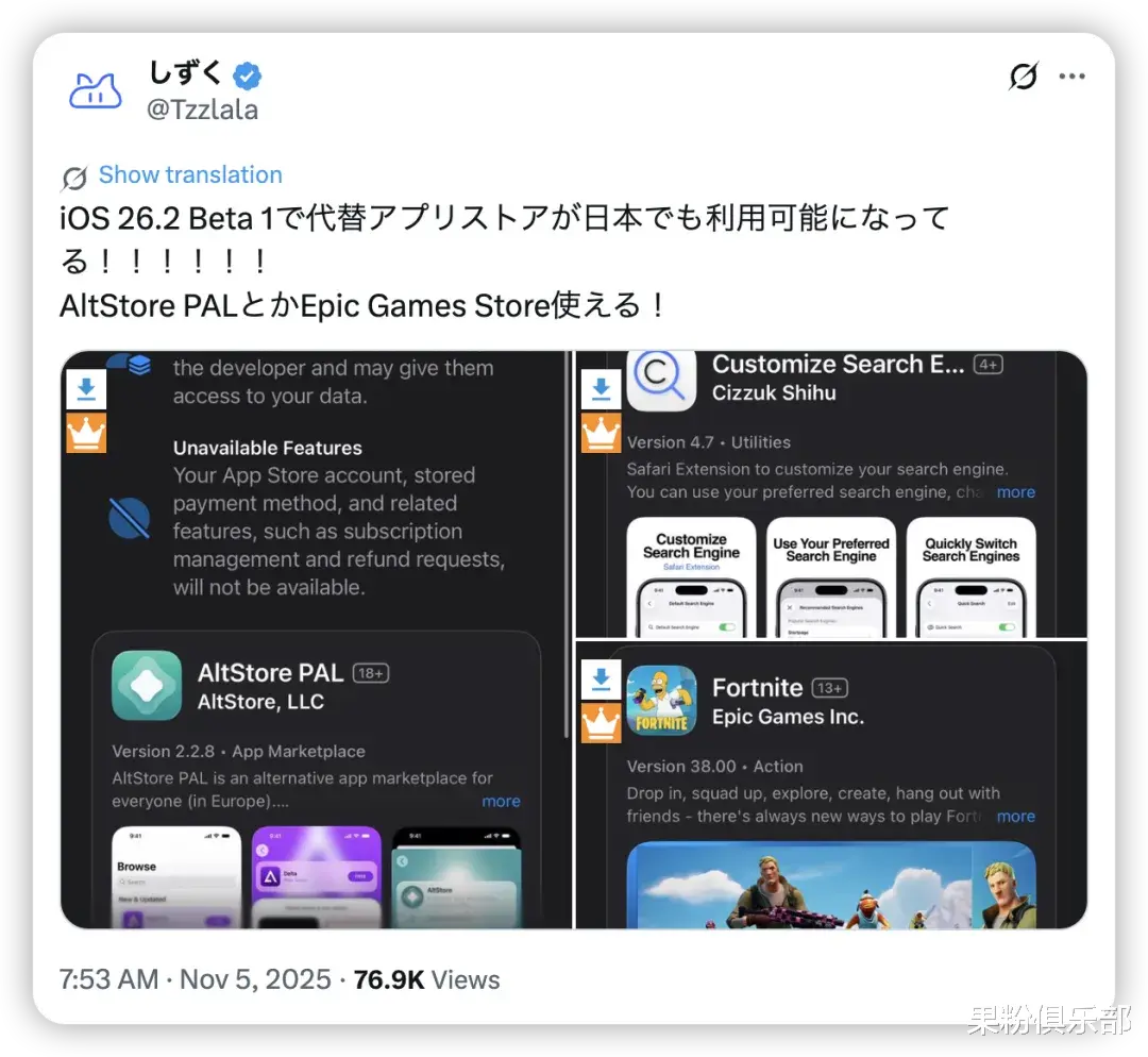 据用户 @Tzzlala 反馈,升级至 iOS 26.2 Beta 版后,日本 iPhone 用户已可以安装 AltSore 这类侧载应用。