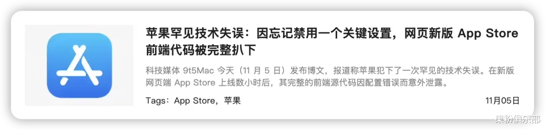 据外媒 9to5Mac 报道,苹果犯下了一次罕见的技术错误,意外泄露了网页版 App Store 的前端源代码。