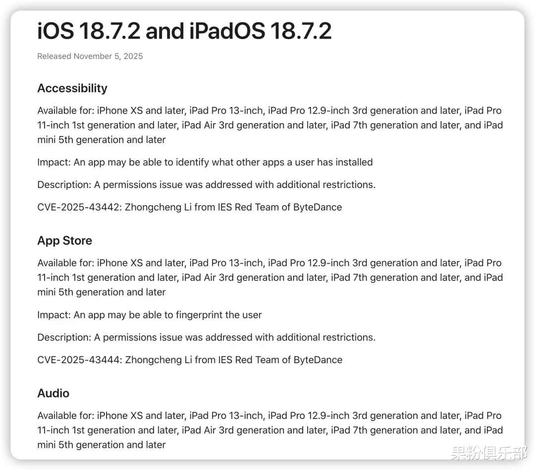 其中绝大部分漏洞都曾在 iOS 26.1 正式版中有所提及,这回算是对旧版系统的查漏补缺。