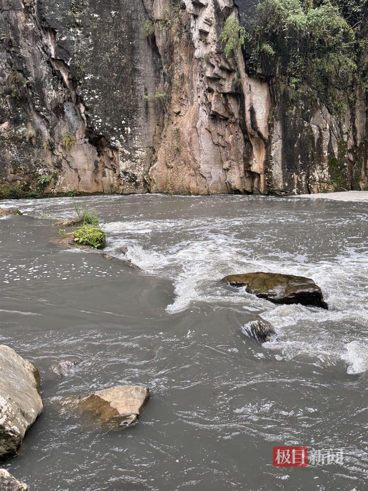 10日清晨,重庆热心市民吴先生(化姓)也跟随者“渔猎齐哥”前往孝子河上游寻找污染源头。道路比较险峻,雨后湿滑泥泞,有消防人员在前方开路,他们到现场后看到已有生态环境部门的工作人员在现场调查。吴先生介绍,还没到河边,就可以明显闻到类似臭鸡蛋的刺鼻臭味,到河边看到不断有黑水从山体的一个溶洞流出,“上游因为下雨,水体是黄色的,和溶洞流出的黑水交汇后,可以看到黄色与黑色水体明显的分界线。”