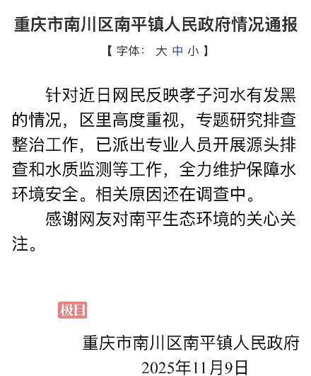 11月9日至10日,博主“渔猎齐哥”连续发视频曝光,位于重庆市南川区南平镇的孝子河河水严重污染,此事引发高度关注。