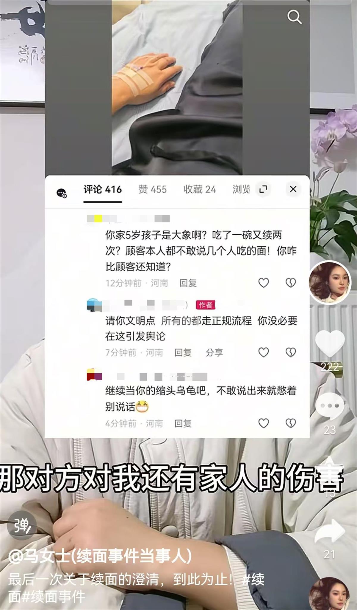 今年10月以来,因为持续遭遇网暴,马女士不得不在账号发布多个视频,还原事发时的经过,以及自己和孩子的肖像被曝光的过程。不过,网友的关注点仍然都集中在“七个人吃一碗面”。近日,她再次发布了多个到当地多个不同面馆吃面续面的视频。马女士称,发布这些视频是为了告诉一些不知情的网友,在河南续面是件很正常的事情。但在评论区,依然充斥着一些不怀好意的言论。“很多骂我的言论都是私密号,我已经拉黑好几百个这种号了。”