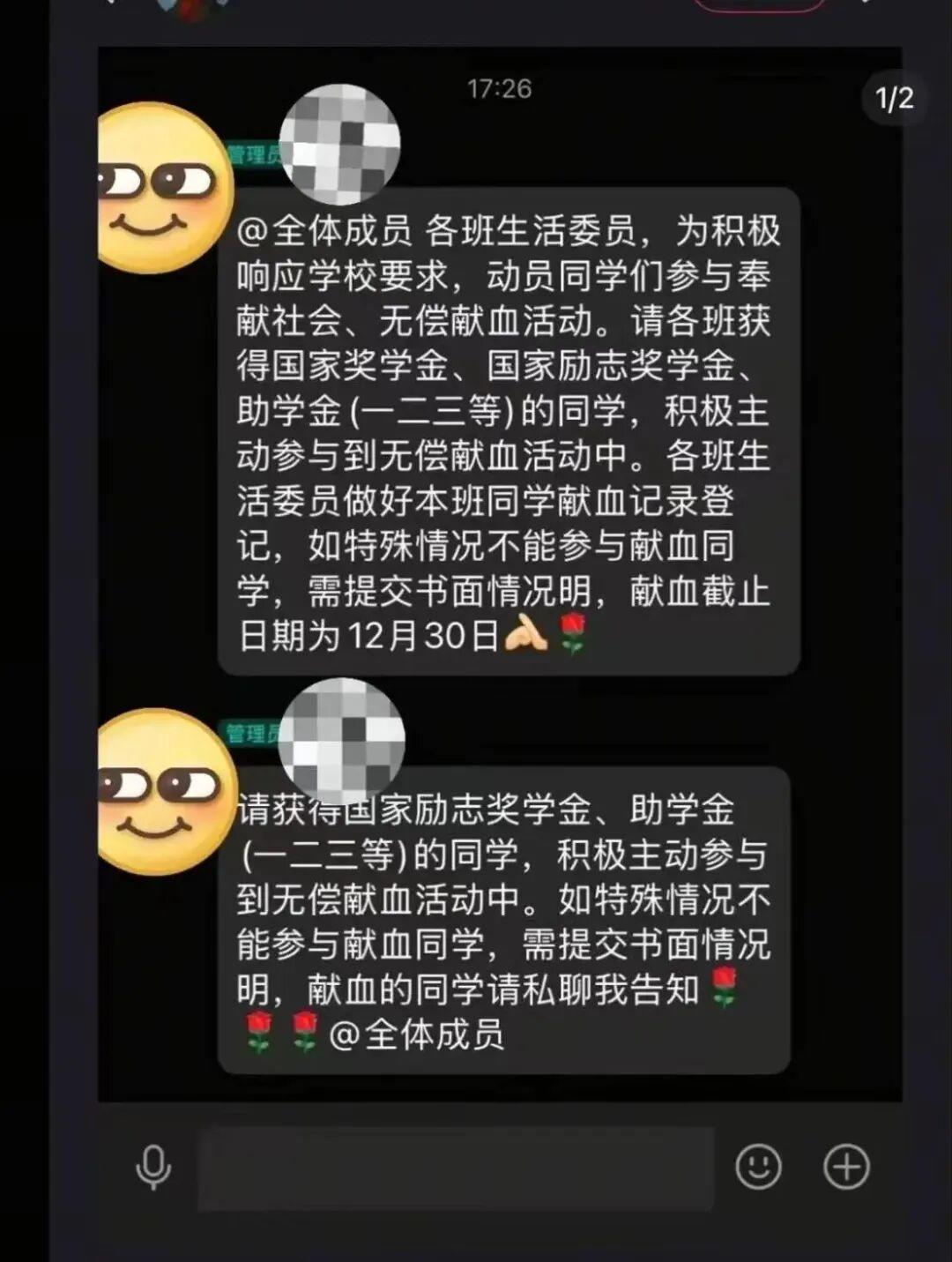 网传通知显示:“各班生活委员,为积极响应学校要求,动员同学们参与奉献社会、无偿献血活动。请各班获得国家奖学金、国家励志奖学金、助学金(一二三等)的同学,积极主动参与到无偿献血活动中。各班生活委员做好本班同学献血记录登记,如特殊情况不能参与献血同学,需提交书面情况明,献血截止日期为12月30日。”