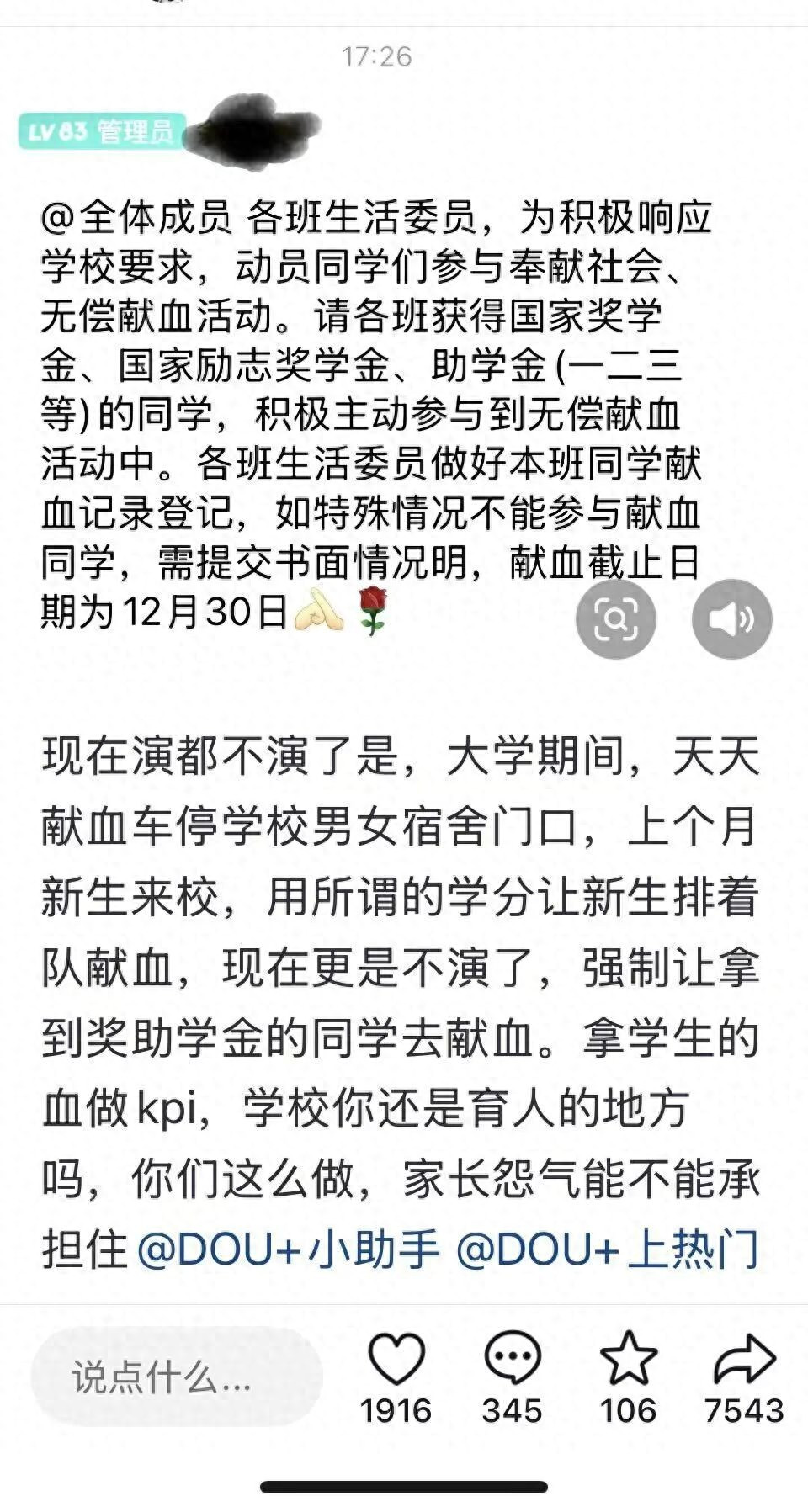 发布者表示,一个班级有30多个人,如果按照通知,10来个拿奖学金和助学金的学生都得献血。
