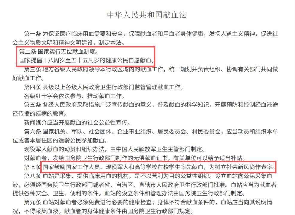 据了解,我国的献血制度建立在 “自愿”与“无偿” 两大基石之上。《中华人民共和国献血法》明确规定国家实行无偿献血制度,提倡十八周岁至五十五周岁的健康公民自愿献血。该法也鼓励特定群体,如国家工作人员、现役军人和高等学校在校学生率先献血,但记者注意到,这里的措辞是“鼓励”而非“强制”。